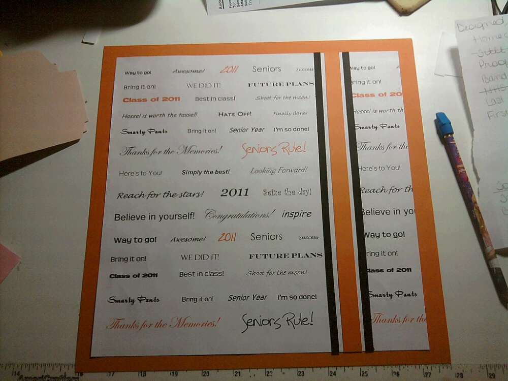 The white paper was printed from my computer with sayings from various stickers. Thought the Senior would like the "Senior Rules" saying a lot. Printed it on cardstock twice and the stripes hide the seam.